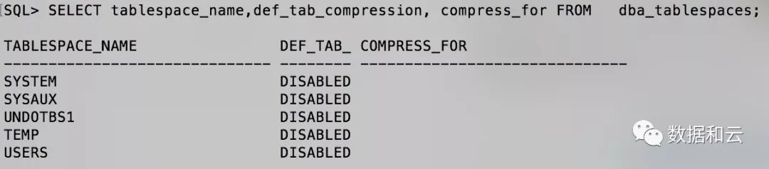 在数据库创建过程中,可以看到对于 SYSTEM 、SYSAUX 表空间,启用了所有操作压缩: