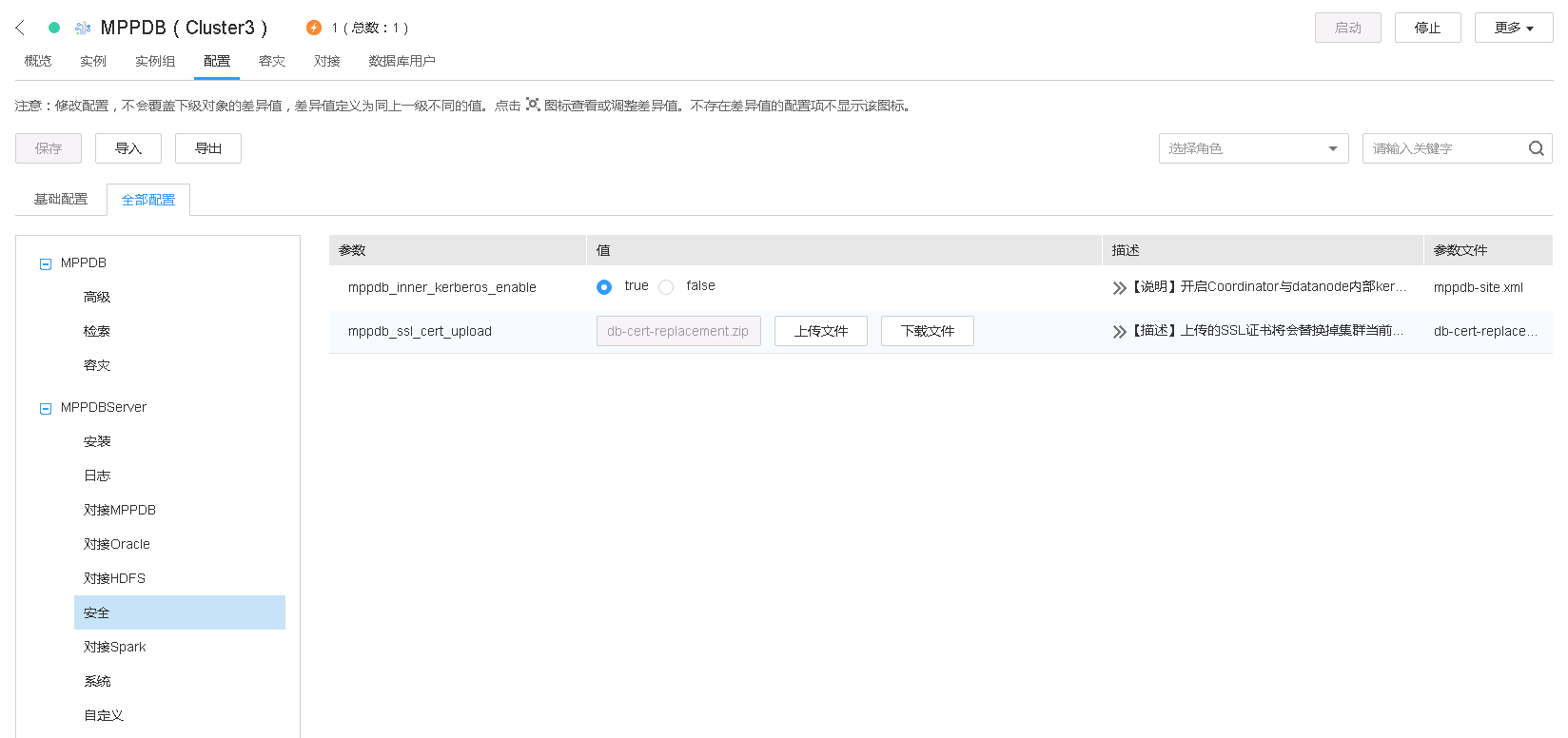 - 登录FusionInsight Manager,选择“集群 > 待操作集群的名称 > 服务 > MPPDB > 配置 > 全部配置”。