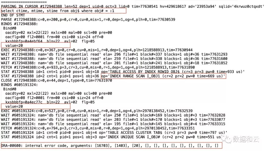 从跟踪文件中,可以找到如下信息,最后执行的是 obj$ 的对象访问,绑定变量传入值是 20 ,