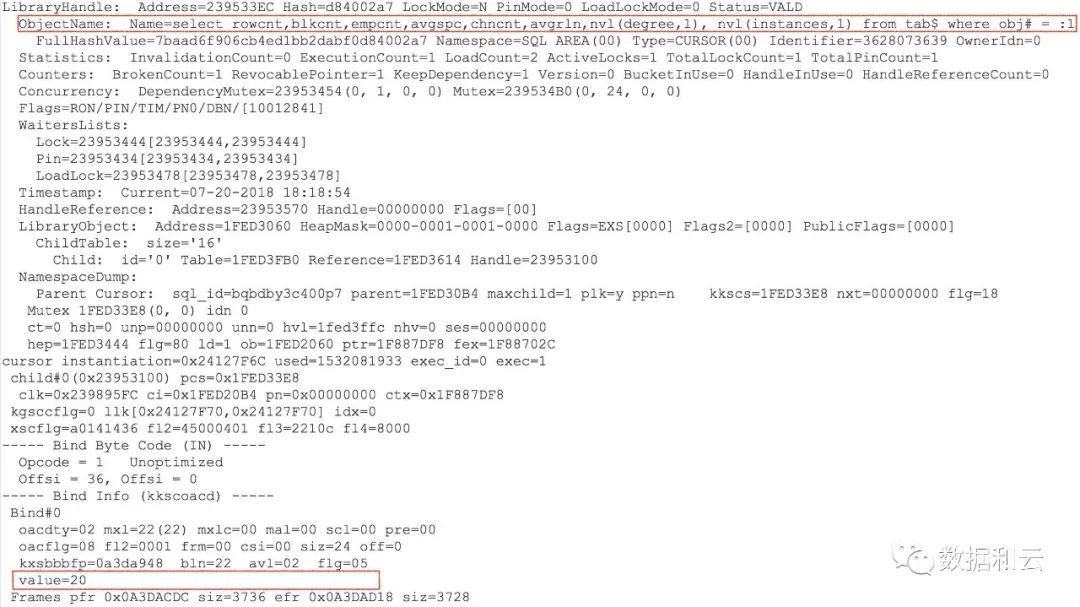 在进程的转储文件中,也可以看懂对于 TAB$ 的递归访问,绑定变量是 20 :
