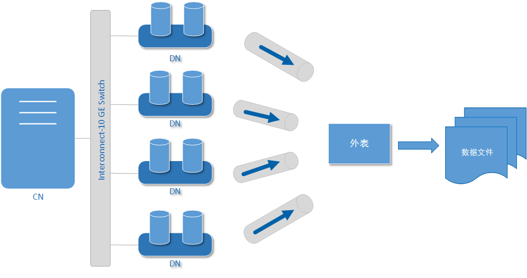 - 通过让各个DN都参与数据导出,充分利用各个设备的计算能力及网络带宽。图1 通过外表导出数据