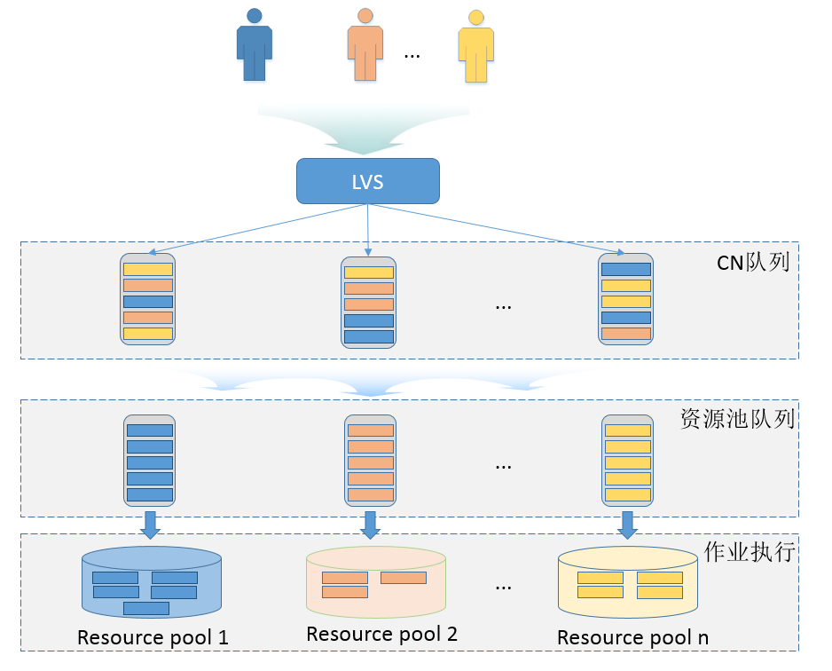 对于受全局并发数量限制的任务,在CN等待队列中,静态并发控制情况下,任务进入资源池的顺序由执行该任务的用户所绑定的资源池的优先级决定;动态负载管理情况下,任务进入资源池的顺序按照先进先出原则。值得注意的是,在动态负载管理情况下,中心协调节点(CCN)上等待的队列,任务进入资源池的顺序由执行该任务的用户所绑定的资源池的优先级决定。