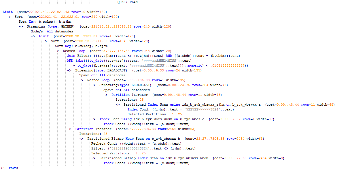 - 分析该执行计划发现,扫描节点已使用Index Scan,耗时主要在最外层Nest Loop Join的Join Filter计算中,且该计算执行了字符串的加减法和不等值比较。