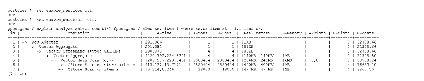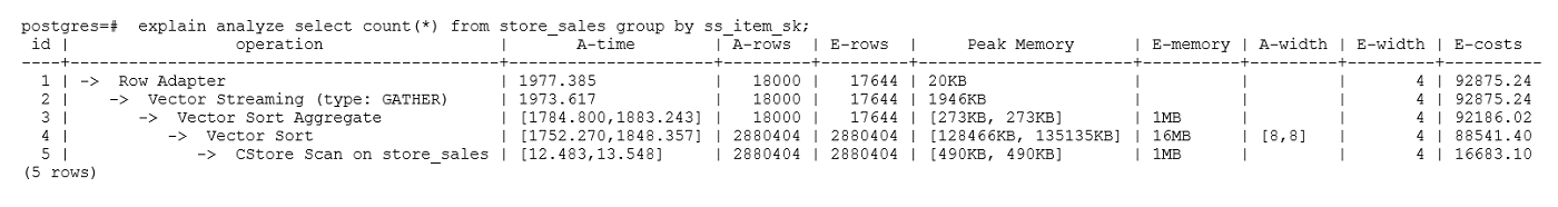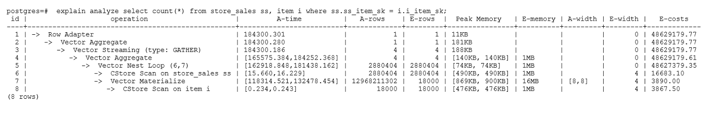 1 2 3 4 5 6 7 8 9 10 11 12 | explain (analyze on, costs off) select * from store_sales where ss_sold_date_sk = 2450944; id | operation | A-time | A-rows | Peak Memory | A-width ----+--------------------------------+---------------------+--------+--------------+--------- 1 | -> Streaming (type: GATHER) | 3666.020 | 3360 | 195KB | 2 | -> Seq Scan on store_sales | [3594.611,3594.611] | 3360 | [34KB, 34KB] | (2 rows) Predicate Information (identified by plan id) ----------------------------------------------- 2 --Seq Scan on store_sales Filter: (ss_sold_date_sk = 2450944) Rows Removed by Filter: 4968936 |