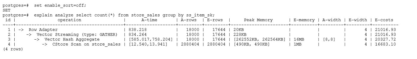 示例3:通常情况下Agg选择HashAgg性能较好,如果大结果集选择了Sort+GroupAgg,则需要设置enable_sort=off,HashAgg耗时明显优于Sort+GroupAgg。