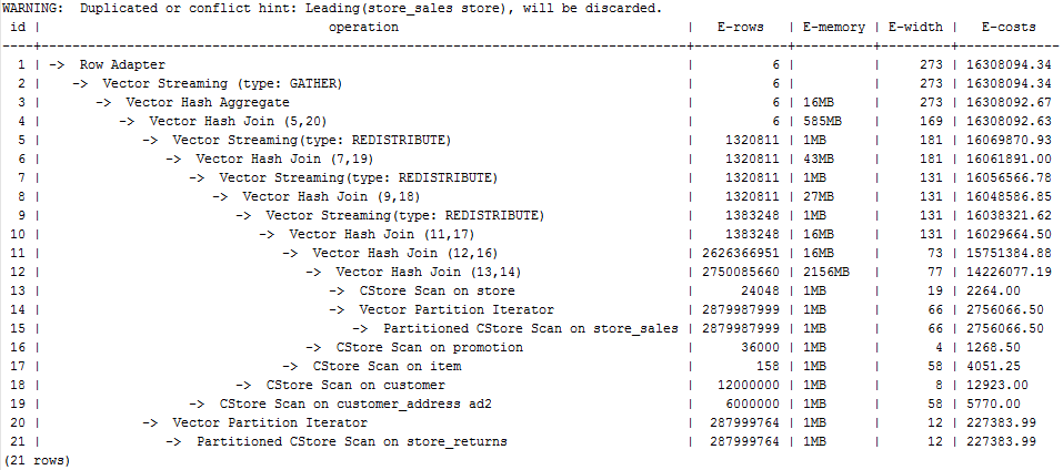 1 2 | explain select /*+ leading((((((store_sales store) promotion) item) customer) ad2) store_returns) leading((store store_sales))*/ i_product_name product_name ... |
