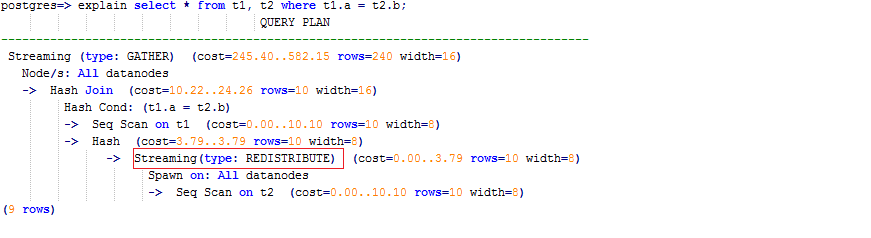 1 2 | CREATE TABLE t1 (a int, b int) DISTRIBUTE BY HASH (a); CREATE TABLE t2 (a int, b int) DISTRIBUTE BY HASH (a); |