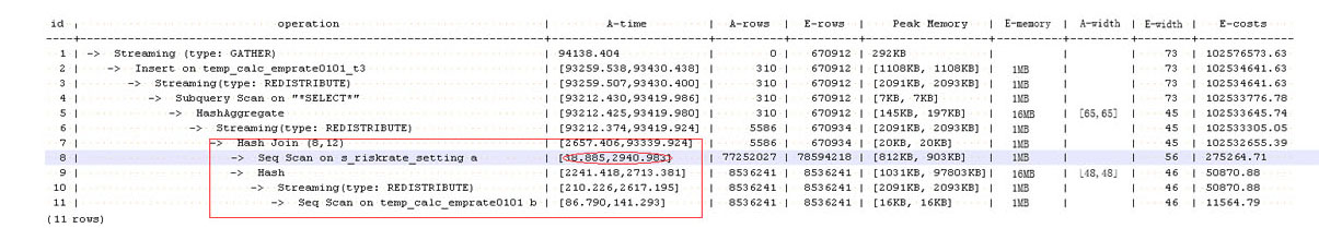上述两个特征表明了此SQL语句存在极为严重的计算倾斜。进一步向HashJoin算子的下层分析发现Seq Scan on s_riskrate_setting也存在极为严重的计算倾斜[38.885,2940.983]。根据Scan的含义推测此计划性能问题的根源在于表s_riskrate_setting数据的分布倾斜。实际分析之后确实发现表s_riskrate_setting存在严重的数据倾斜。整改之后性能从94s提升为50s。