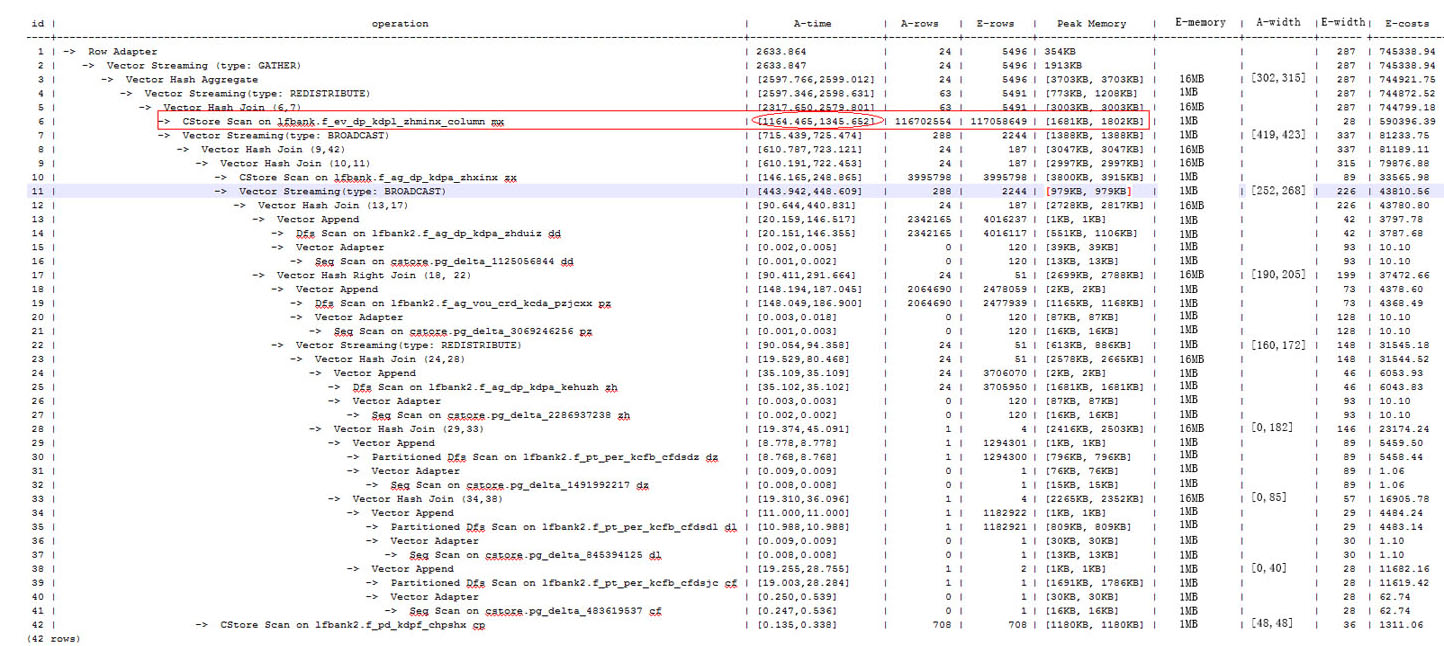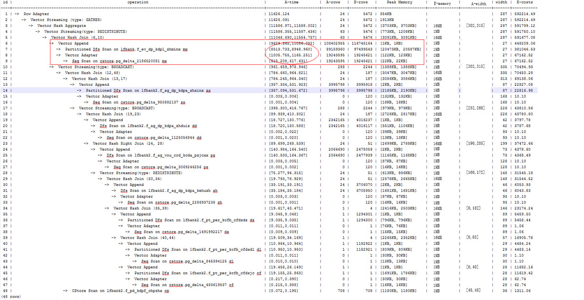 尝试把lfbank.f_ev_dp_kdpl_zhmin表修改为列存表,然后在yezdminc列上建PCK(局部聚簇),并设置PARTIAL_CLUSTER_ROWS=100000000。执行计划优化为: