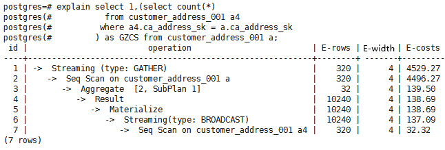 1 2 3 4 | select 1, (select count(*) from customer_address_001 a4 where a4.ca_address_sk = a.ca_address_sk) as GZCS from customer_address_001 a; |
