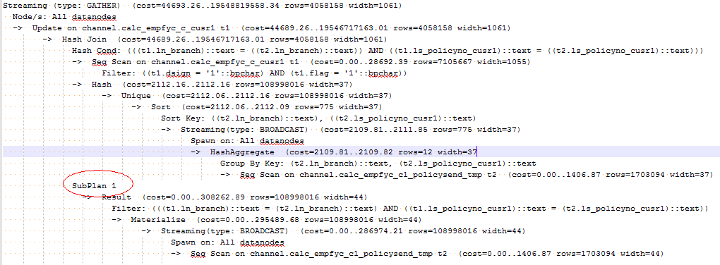 很明显,执行计划中存在SubPlan,并且SubPlan中的运算相当重,即此SubPlan是一个明确的性能瓶颈点。