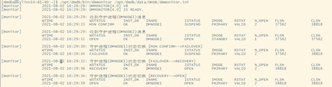 su - dmdba/opt/dmdb/bin/dmmonitor /opt/dmdb/data/DMDB/dmmonitor.ini
