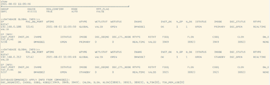 至此一主一备的实时数据守护系统搭建完毕,在搭建步骤和各项配置都正确的情况下,在监视器上执行 show 命令,可以监控到所有实例都处于 Open 状态,所有守护进程也都处于 Open 状态,即为正常运行状态。