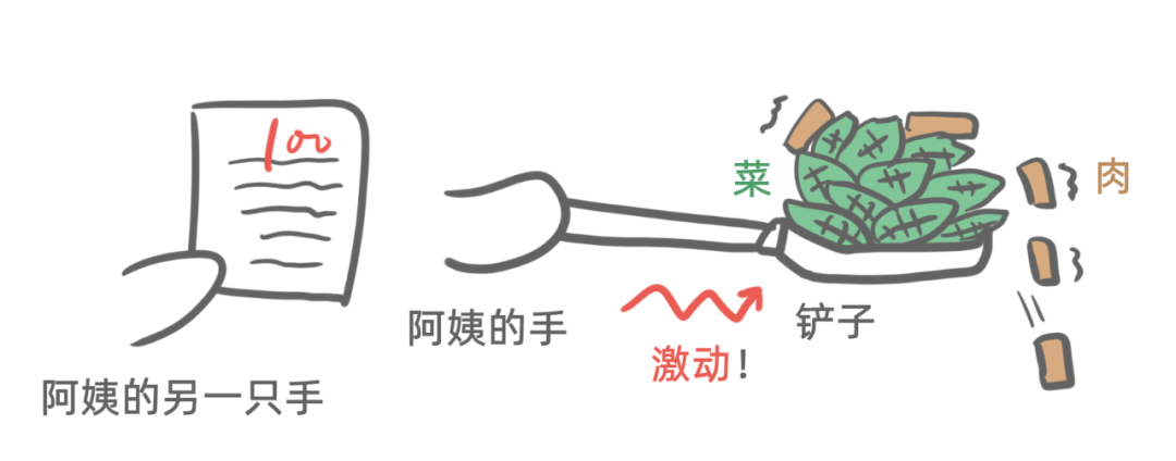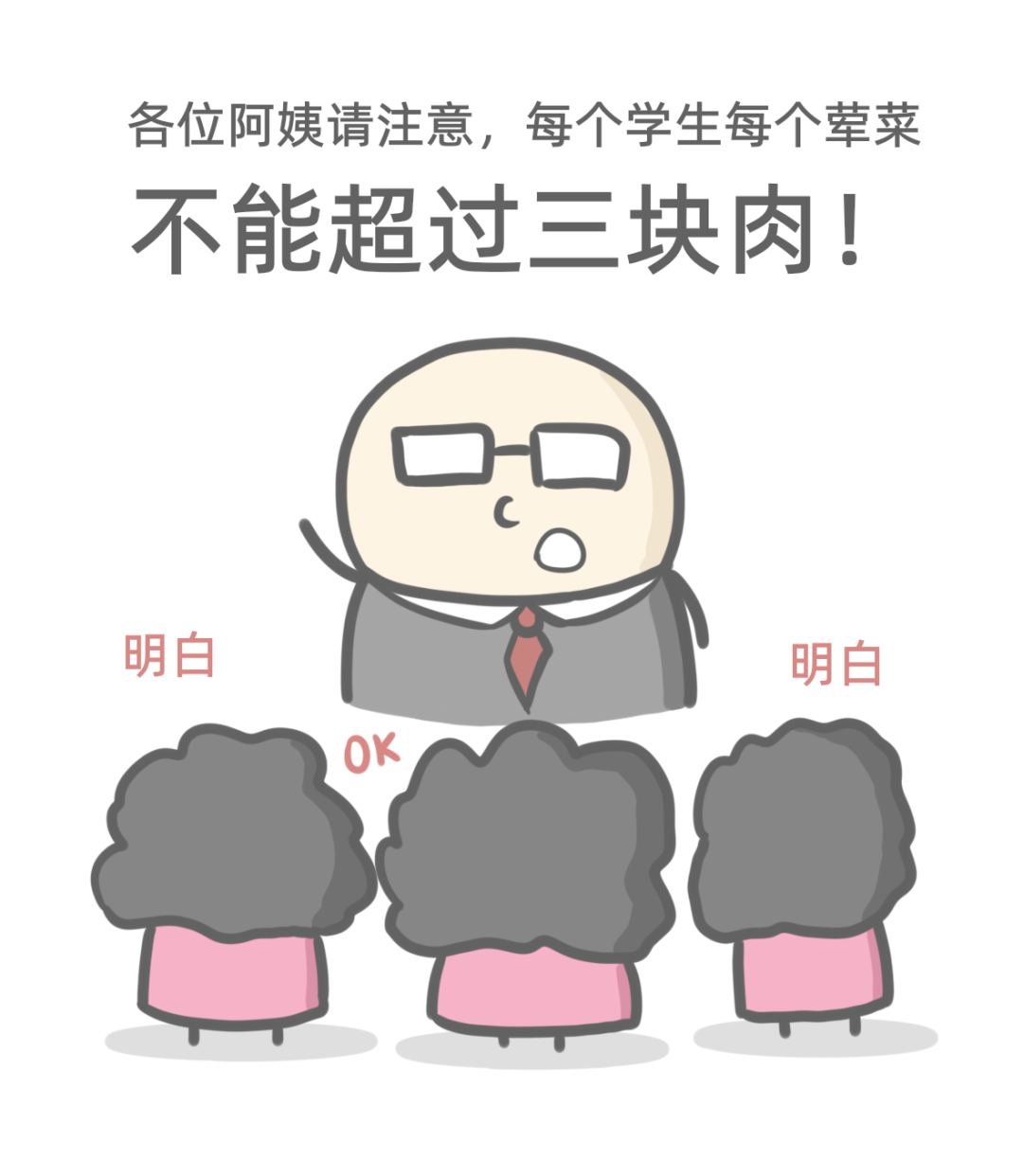 饭堂阿姨突然发现打菜的这个同学似乎没有给波波和阿菌点赞,怒从心起,把肉抖下去了。