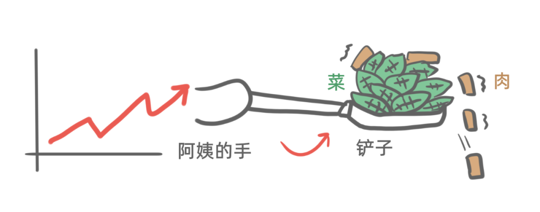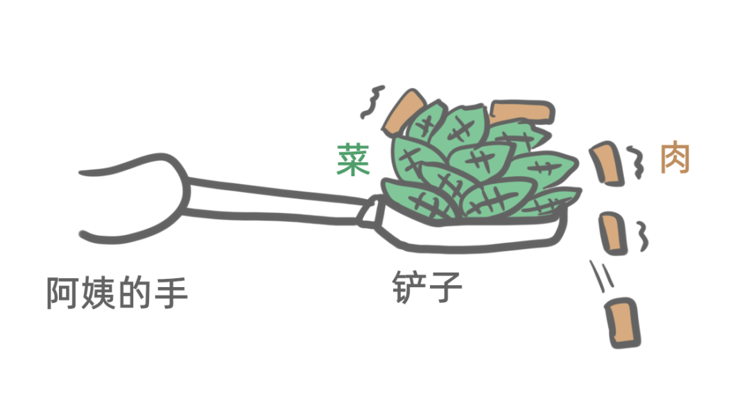 饭堂阿姨为了爽通常会一铲子铲下去,但是菜加上肉是很重的,通常来说肉会轻一点,会在上面,所以通过适当的手抖能把上面的肉抖掉,保证把精华部分留给学生就行。