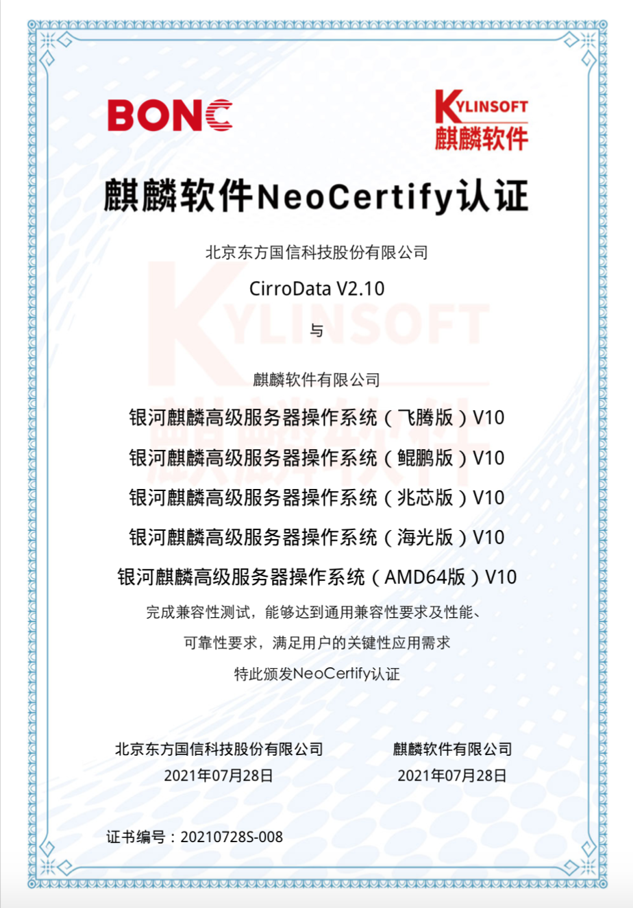 近日,麒麟软件有限公司与北京东方国信科技股份有限公司完成了双方产品的兼容性测试工作。此次兼容性测试的产品有CirroData V2.10分布式数据库与银河麒麟高级服务器操作系统(飞腾版)V10,银河麒麟高级服务器操作系统(鲲鹏版)V10,银河麒麟高级服务器操作系统(兆芯版)V10,银河麒麟高级服务器操作系统(海光版)V10,银河麒麟高级服务器操作系统(AMD64版)V10。测试结果表明,双方产品在兼容性、可靠性和性能等方面全部达成预期目标,能够满足用户的关键性需求,且整体系统功能正常、运行稳定,达到互认证标准。