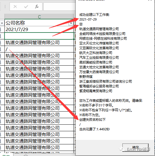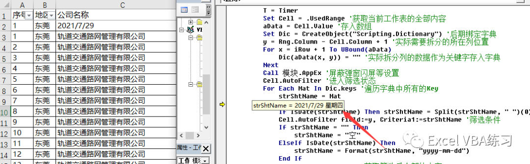 第37至42行,判断筛选的内容是否日期格式或者为空,修改strShtName变量避免不必要的错误,后续需要使用该变量作为表名,当然也可以判断是否符合工作表的命名规则,这里仅判断空值与日期,因为这个比较常见些