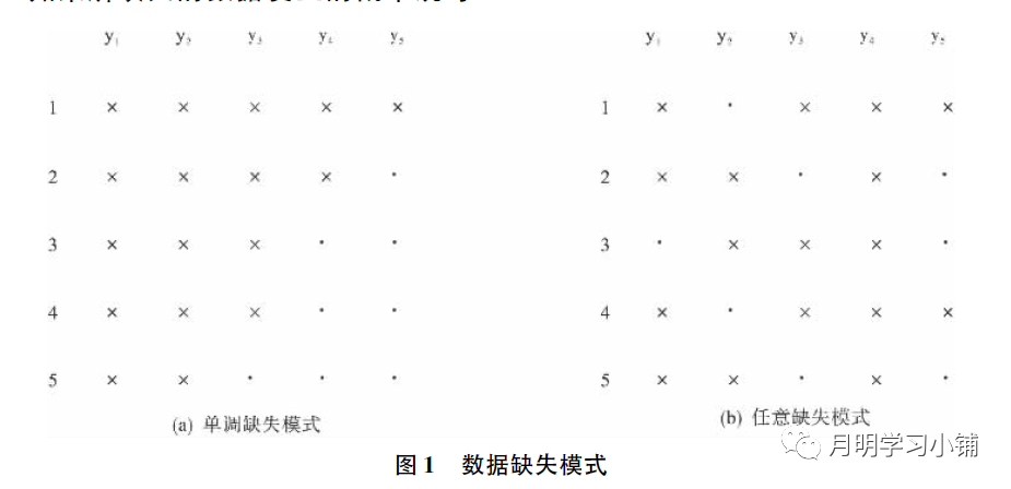数据缺失按照缺失模式可以分为单调缺失模式、任意缺失模式。可参照下图加以理解。