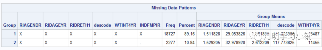 /*在填补模型中未加入descode,权重*/proc mi data = Analysis_data_1 nimpute = 5 seed = 41out = imputation;class RIAGENDR RIDRETH1;monotone regression (INDFMPIR);var RIAGENDR RIDRETH1 RIDAGEYR INDFMPIR;run;proc surveymeans data = imputation;strata sdmvstra; cluster sdmvpsu; weight WTINT4YR;by _imputation_;domain RIAGENDR;var INDFMPIR;ods output domain = imputation_gender;run;proc sort data = imputation_gender;by varname RIAGENDR _imputation_;run;proc mianalyze data = imputation_gender edf = 29;by varname RIAGENDR;modeleffects mean;stderr stderr;run;