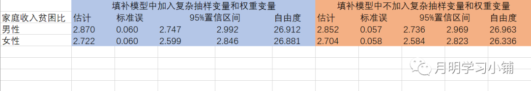 其实从图片可以看出,加入复杂抽样设计相关变量并没有使点估计和置信区间产生显著改变,但是通过这一点去推断复杂抽样设计相关变量对相关协变量缺失毫无影响也是不合理的。