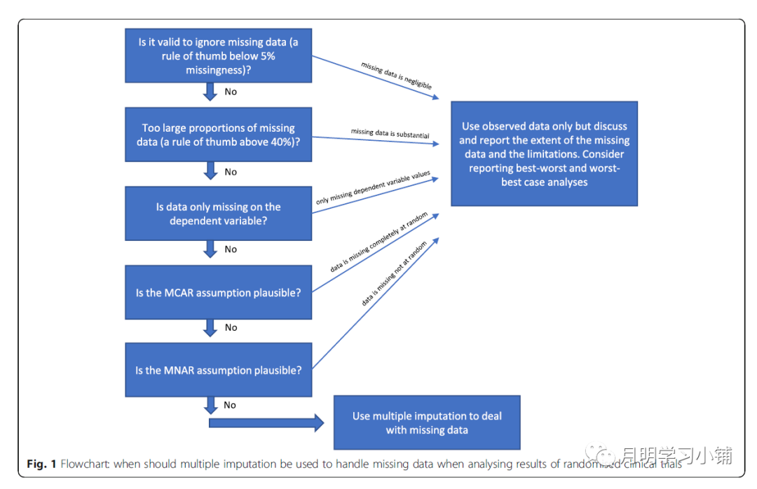 akobsen JC, Gluud C, Wetterslev J, Winkel P. When and how should multiple imputation be used for handling missing data in randomised clinical trials - a practical guide with flowcharts. BMC Med Res Methodol. 2017;17(1):162.