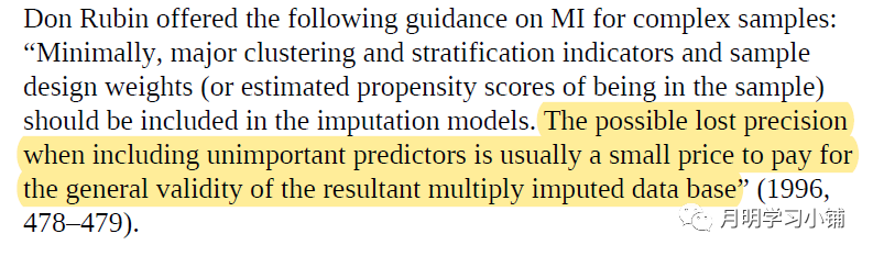 这两个点并不是孤立的,而是相互佐证的。正是因为要尽可能满足随机缺失假设,本书的作者才会把复杂抽样设计相关变量加入填补模型;也正是因为加入了相关变量,才使得假设更为合理,之后分析造成的偏倚也更小。