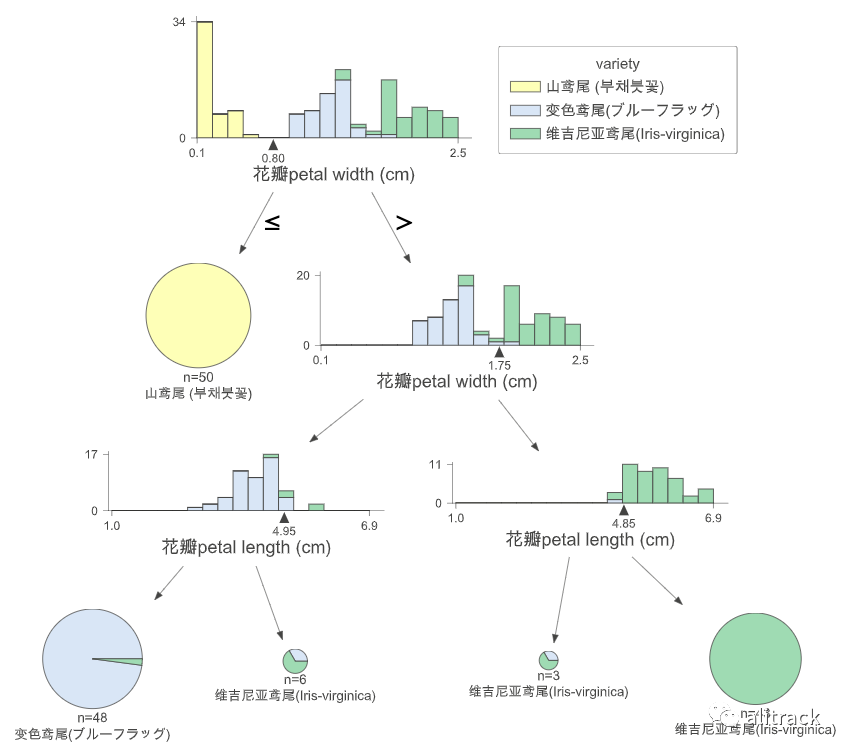 from sklearn.datasets import *from sklearn import treefrom dtreeviz.trees import *classifier = tree.DecisionTreeClassifier(max_depth=3)iris = load_iris()classifier.fit(iris.data, iris.target)#测试需要feature_names=['萼片sepal length (cm)','sepal width (cm)','花瓣petal length (cm)','花瓣petal width (cm)']class_names=["山鸢尾 (부채붓꽃)", "变色鸢尾(ブルーフラッグ)", "维吉尼亚鸢尾(Iris-virginica)"]## 画决策树viz = dtreeviz(classifier, iris.data, iris.target, target_name='variety', feature_names=feature_names, class_names=class_names # need class_names for classifier )viz