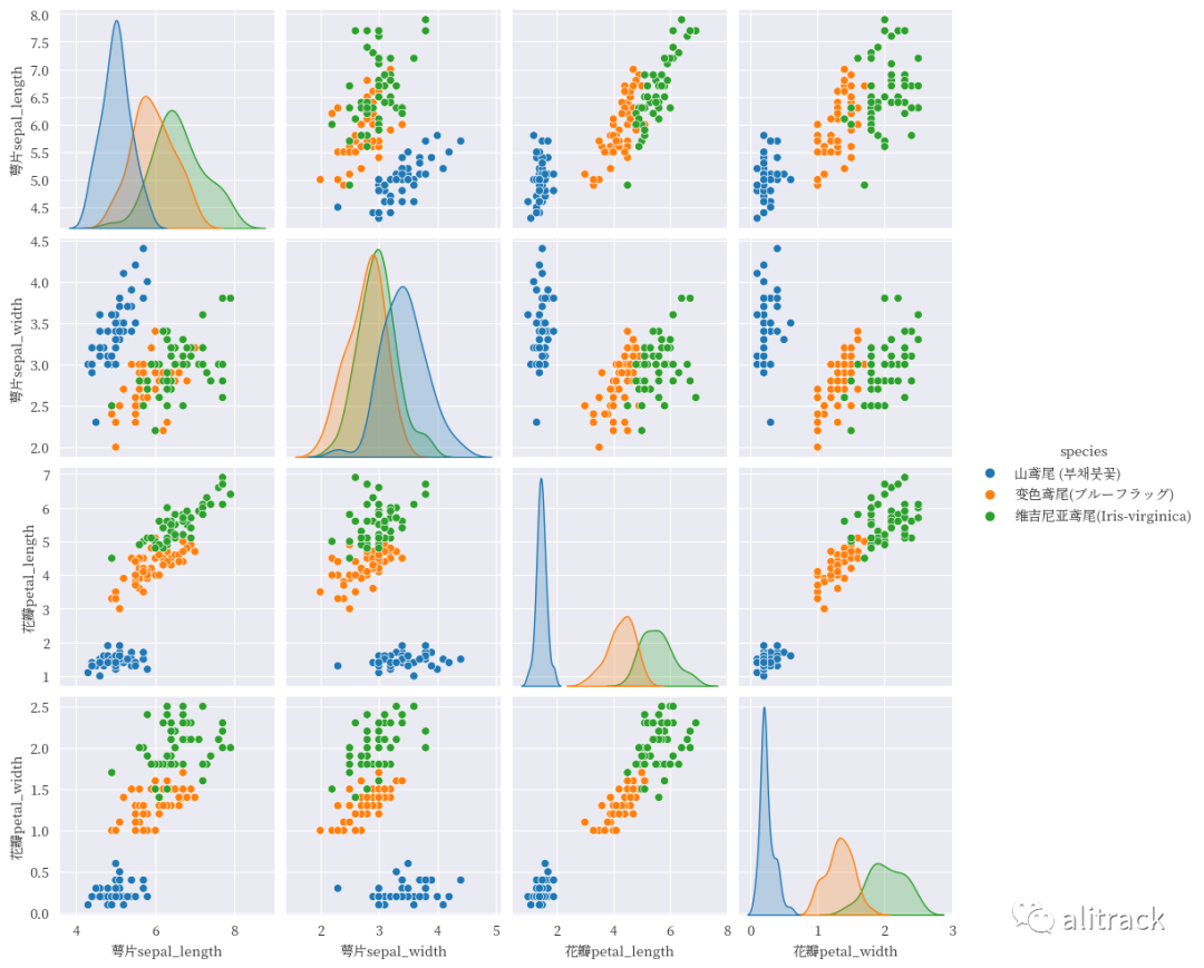 import seaborn as snsfrom matplotlib import pyplot as pltiris = sns.load_dataset('iris')iris.columns=['萼片sepal_length', '萼片sepal_width', '花瓣petal_length', '花瓣petal_width', 'species']iris.replace(["setosa","versicolor","virginica"], ["山鸢尾 (부채붓꽃)", "变色鸢尾(ブルーフラッグ)", "维吉尼亚鸢尾(Iris-virginica)"], inplace=True)# sns.set_style("whitegrid",{"font.sans-serif":plt.rcParams['font.sans-serif']})# style used as a theme of graph# for example if we want black# graph with grid then write "darkgrid"sns.set_style("whitegrid")#set_style 会 override plt.rcParams['font.serif'],我们再override回来plt.rcParams['font.sans-serif']=[default_font]+plt.rcParams['font.sans-serif']plt.rcParams['axes.unicode_minus']=False # 让负号也能正常显示sns.pairplot(iris, hue="species")