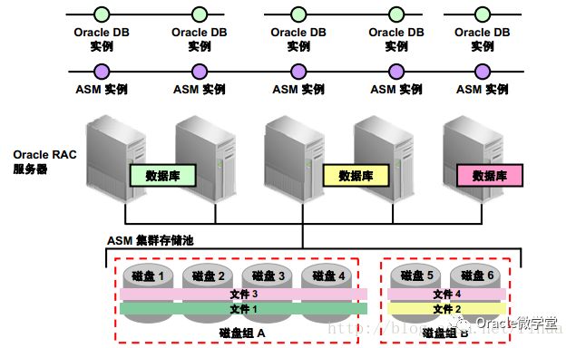 从磁盘组内分配文件空间。磁盘组中存储的文件的内容将在该磁盘组的磁盘中平均分布或条带化,以便消除热点并在各磁盘上提供一致的性能。每个ASM 文件都完全包含在一个磁盘组中。但是,一个磁盘组可以包含属于多个数据库的文件,而一个数据库可以使用来自多个磁盘组的不同文件。
