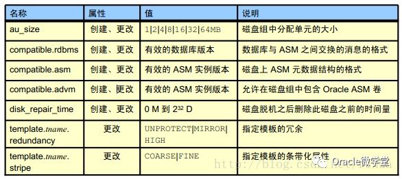 每当创建或更改ASM 磁盘组时,都可以使用CREATE DISKGROUP和ALTER DISKGROUP命令新增的ATTRIBUTE子句更改其属性。图中的表简要概述了这些属性: