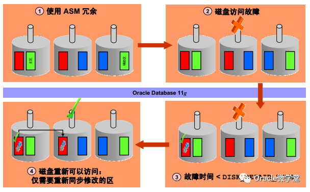 ASM 快速镜像重新同步可以显著减少重新同步临时故障磁盘所需的时间。如果某个磁盘因临时故障而脱机,ASM 将跟踪在中断期间发生修改的区。临时故障被修复后,ASM 可以快速地仅重新同步在中断期间受影响的ASM 磁盘区。