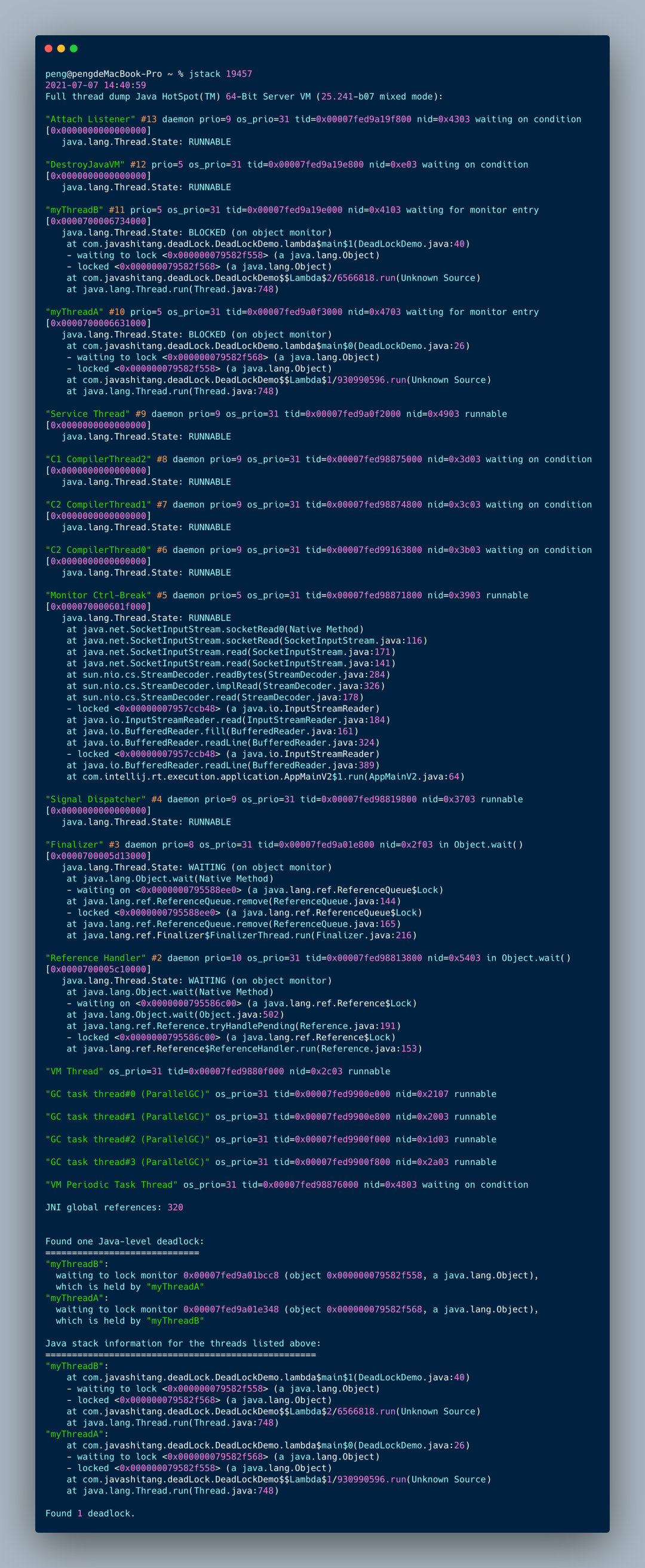 「我写了一个死锁的例子,启动后执行jps找到进程id为19457」