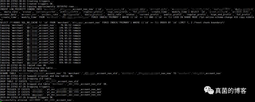 log显示执行时间 02:38:01 - 02:47:26,数据copy正常,触发器增删正常,account_nav表成功加上字段和索引。