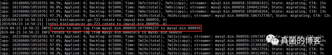 可以看到gh-ost在数据复制过程中,写满一个binlog后会自动新开一个binlog,所以不会产生pt-osc出现大binlog的情况。