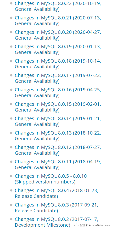 5 版本变动频繁, 从下图可以看出MYSQL 8 的版本的变动的情况, 这样的变更的速度,让使用者无所适从, 刚确认好一个版本后, 就发现几个月后又有新的版本, 并且这个变动有些还是核心功能的变动,并不是BUG的FIX ,这就让人有些...... 所以有些企业使用MYSQL 8 等了又等, 不知道哪个好,应该用那个. 这说明两个问题, 1 MYSQL 8 迭代的速度快 2 MYSQL 本身的规划有问题,未考虑用户的在使用中和版本选择问题, MYSQL 你的版本迭代能在"快"一点吗?