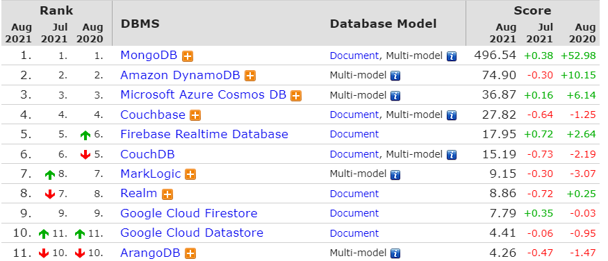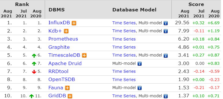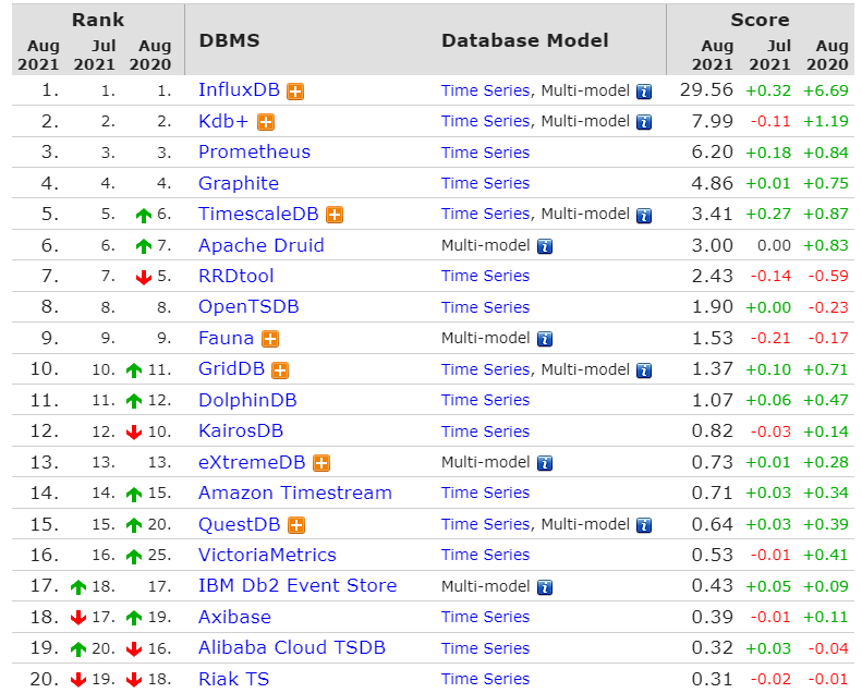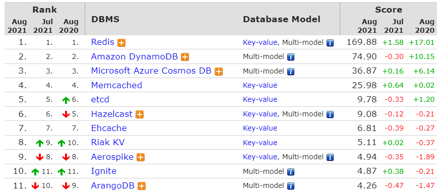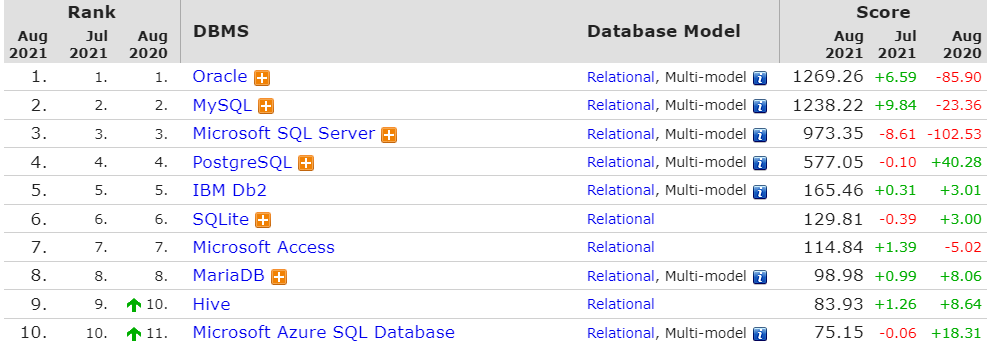 DB-Engines最近发布了2021年8月份的数据库排名,是根据数据库管理系统当前的流行程度进行排名,排名每月更新一次。DB-Engins排名标准是:通过调研这些数据库在搜索引擎(谷歌或者必应)被搜索的热度,搜索结果的数量,相关工作岗位信息,以及一些社交网站上的相关度信息。根据这个榜单显示,前十名的数据库排名几乎没有太大的变化,前三名依旧是Oracle、MySQL和Microsoft SQL Server。虽然排名没有变动,但单个数据库的分数却变化不少,其中Microsoft SQL Server的分数在7、8月分数连续下跌,跌幅最大达到102.53分。排在第四,第五的PostgreSQL、MongoDB 上升趋势明显,两者8月分数分别比7月上涨了40.28分、52.98分。排名占据前二十的数据库绝大多数都是关系型数据库,由此可见关系型数据库在市场上依旧是主流数据库。但是关系型数据库在“可扩展性、高并发以及性能”方面,存在非常多的问题,比如:传统的关系型数据库以及二维关系模型,很难高效地扩展到多个存储节点上。这些问题催生了“非关系型数据库”的发展,即所谓的“NoSQL”,这类NoSQL也有很大的发展空间。关系型数据库的榜首是Oracle(甲骨文)。Oracle 数据库是目前世界上使用最为广泛的关系型数据库管理系统,甲骨文数据库主要在银行系统、航空订票系统、电信账单、政府机构等全球企业经营方面发挥了重要作用。Key-Value数据库排行榜第一是Redis。Redis具有高性能读写、多数据类型支持、数据持久化、高可用架构,可用于缓存,事件发布或订阅,高速队列等场景。文件存储数据库排行榜第一是MongoDB 。MongoDB是一个由C++语言编写的,基于分布式文件存储的开源数据库系统 。MongoDB 可在 高负载的情况下,添加更多的节点,可以保证服务器性能 。MongoDB 可为Web应用提供可扩展的高性能的数据存储解决方案。InfluxDB是一个开源的、高性能的时序型数据库,在时序型数据库DB-Engines Ranking上排名第一。时序型数据库是存放时序数据的专用型数据库,并且支持时序数据的快速写入、持久化、多纬度的实时聚合运算等功能。完整排名链接:https://db-engines.com/en/ranking/time+series+dbms