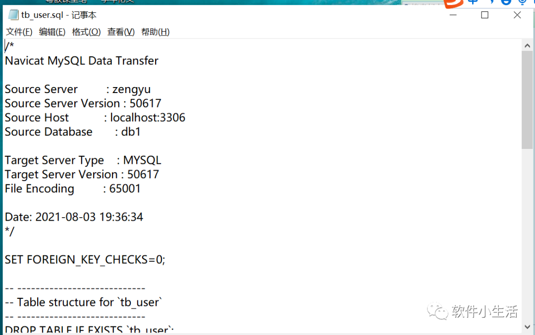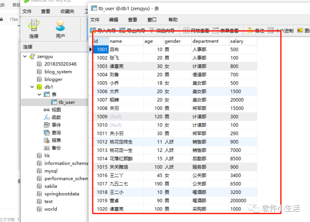 内容如下:/*Navicat MySQL Data TransferSource Server : zengyuSource Server Version : 50617Source Host : localhost:3306Source Database : db1Target Server Type : MYSQLTarget Server Version : 50617File Encoding : 65001Date: 2021-08-03 19:36:34*/SET FOREIGN_KEY_CHECKS=0;-- ------------------------------ Table structure for `tb_user`-- ----------------------------DROP TABLE IF EXISTS `tb_user`;CREATE TABLE `tb_user` (`id` int(11) NOT NULL,`name` varchar(255) DEFAULT NULL,`age` int(11) DEFAULT NULL,`gender` varchar(255) DEFAULT NULL,`department` varchar(255) DEFAULT NULL,`salary` decimal(65,0) DEFAULT NULL,PRIMARY KEY (`id`)) ENGINE=InnoDB DEFAULT CHARSET=utf8;-- ------------------------------ Records of tb_user-- ----------------------------INSERT INTO `tb_user` VALUES ('1001', '吕布', '10', '男', '人事部', '500');INSERT INTO `tb_user` VALUES ('1002', '张飞', '20', '男', '人事部', '100');INSERT INTO `tb_user` VALUES ('1003', '诸葛亮', '30', '女', '计谋部', '800');INSERT INTO `tb_user` VALUES ('1004', '刘备', '20', '男', '傻逼部', '700');INSERT INTO `tb_user` VALUES ('1005', '小乔', '18', '女', '美女部', '500');INSERT INTO `tb_user` VALUES ('1006', '大乔', '20', '女', '美女部', '1500');INSERT INTO `tb_user` VALUES ('1007', '貂蝉', '20', '女', '美女部', '20000');INSERT INTO `tb_user` VALUES ('1008', '关羽', '100', '男', '将军部', '15000');INSERT INTO `tb_user` VALUES ('1009', null, '120', '男', '计谋部', '300');INSERT INTO `tb_user` VALUES ('1010', null, '10', '女', '计谋部', '100');INSERT INTO `tb_user` VALUES ('1011', '关小羽', '30', '男', '将军部', '290');INSERT INTO `tb_user` VALUES ('1012', '桃花定终生', '11', '人妖', '销售部', '900');INSERT INTO `tb_user` VALUES ('1013', '桃花定一生', '12', '人妖', '销售部', '7000');INSERT INTO `tb_user` VALUES ('1014', '花落红颜醉', '15', '人妖', '后勤部', '8500');INSERT INTO `tb_user` VALUES ('1015', '关关雎鸠', '100', '人妖', '服务部', '900');INSERT INTO `tb_user` VALUES ('1016', '王二丫', '45', '女', '公关部', '3400');INSERT INTO `tb_user` VALUES ('1017', '九五二七', '190', '男', '公关部', '6500');INSERT INTO `tb_user` VALUES ('1018', '王二小', '10', '男', '喝酒部', '3200');INSERT INTO `tb_user` VALUES ('1019', '董卓', '90', '男', '喝酒部', '200000');INSERT INTO `tb_user` VALUES ('1020', '诸葛亮', '100', '男', '采购部', '1000');
