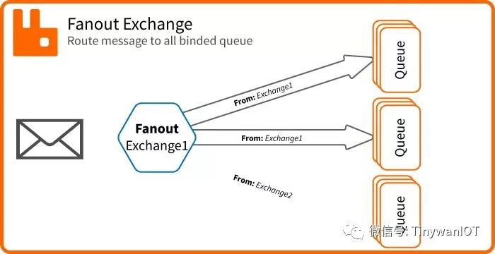 。你只需要简单的将队列绑定到交换机上。一个发送到交换机的消息都会被转发到与该交换机绑定的所有队列上。