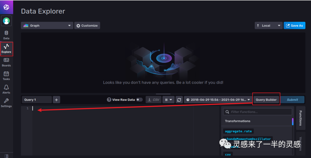 开发者工具包括Flux、CLI和客户端。提到开发者工具,我就想起自己找了半天都没有找到的语言输入的地方,上面提到的Flux一方面可以在UI中操作--如下图所示,但语言和帮助文档中不太相符,初学者很容易懵圈;也可以配置Flux REPL操作,可以参考下面链接的内容,我这一块是失败了的,好像是go没配置好,不过我对go不感兴趣,所以就放弃了。CLI不太推荐,毕竟我们是要处理大批量数据的。客户端我用的是python客户端,完了好好复盘。这里就不再详细描述Flux如何写入数据了,我的做法是用python读取文件、组合DataFrame,然后再通过写入API传入InfluxDB,具体做法放到InfluxDB_python_client中详述,这里比较急的朋友,可以先看帮助文件试着操作一下。