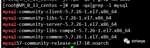 如果操作系统是 centos7,系统会默认安装 Mysql 分支产品 mariadb,需要卸载,通过命令查看现有安装版本