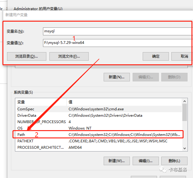 系统变量path中新增一条变量:F:\mysql-5.7.29-winx64