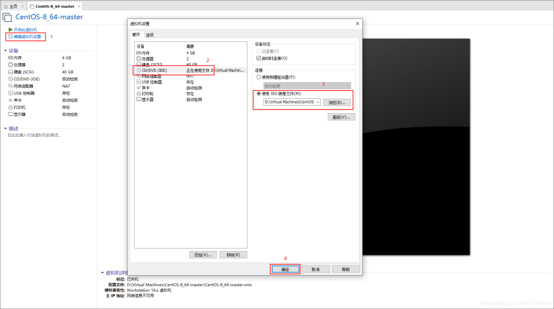 16.在主界面点击编辑虚拟机设置,选择下载好的CentOS8映像文件,点击确认,这样虚拟机就创建好了