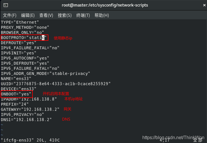 修改为静态ip,修改BOOTPROTO和ONBOOT对应的配置