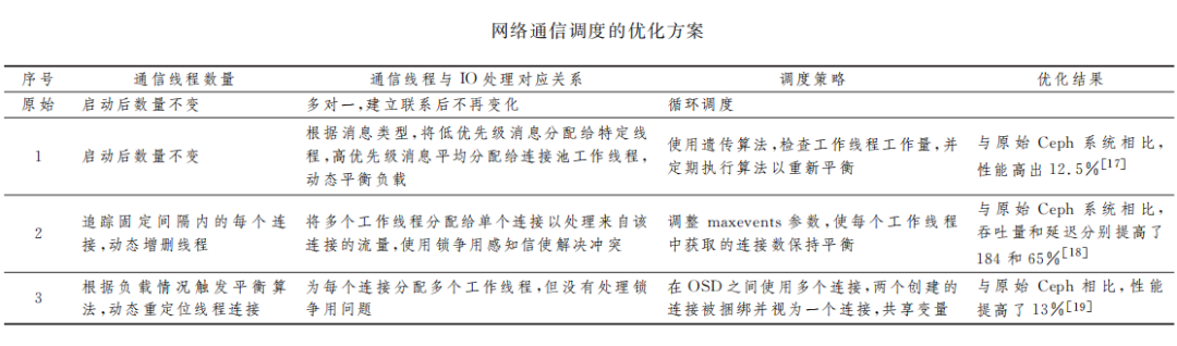 Async模式使用线程池,可兼顾资源和性能的平衡,但早期其设计是基于循环的简单调度方案,未考虑传输数据大小和线程负载。这种早期设计会导致工作线程负载不平衡,在高负荷情况下产生一些性能问题。Han等提出了一种用于Ceph文件系统的动态消息感知通信的调度程序,以解决工作线程调度不平衡的问题,从而提高性能。他提出的调度算法根据传入消息的类型来平衡工作线程的工作量,同时避免了工作线程之间不必要的连接转换。