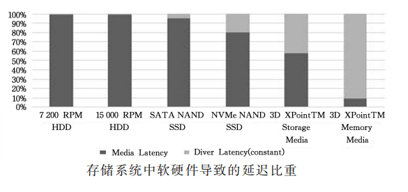 随着3DXpoint和非易失内存等技术的发展与成熟,最快的存储介质性能已接近内存性能。使用新型存储器件的系统中软件已成为瓶颈。如图所示,HDD,SATASSD,NVMe NANDSSD,3 DXPointStorage,3DXPoint Memory系统中的软件造成的延迟分别是0,10%,20%,40%和90%。通过重构软件的体系结构来充分发挥高速存储介质的性能是目前的一个研究热点。