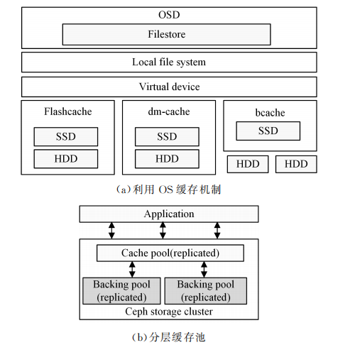 根据第一种方案,在使用FileStore时,文件系统可以识别并使用异构来存储介质,并将其中的SSD作为缓存,其架构如图7(a)所示。这种方案可以依赖已有的缓存工具(如dm-cache,bcache,FalshCache)来实现该功能,也可以使用现有的多种缓存控制方法。其中,dm-cache作为linux内核的一部分,采用devicemapper机制以允许用户建立混合卷;bcache是linux内核块层缓存,使用SSD作为HDD硬盘的缓存,从而起到加速作用;FlashCache可智能缓存最近读取过的用户数据或元数据,从而加快数据访问。