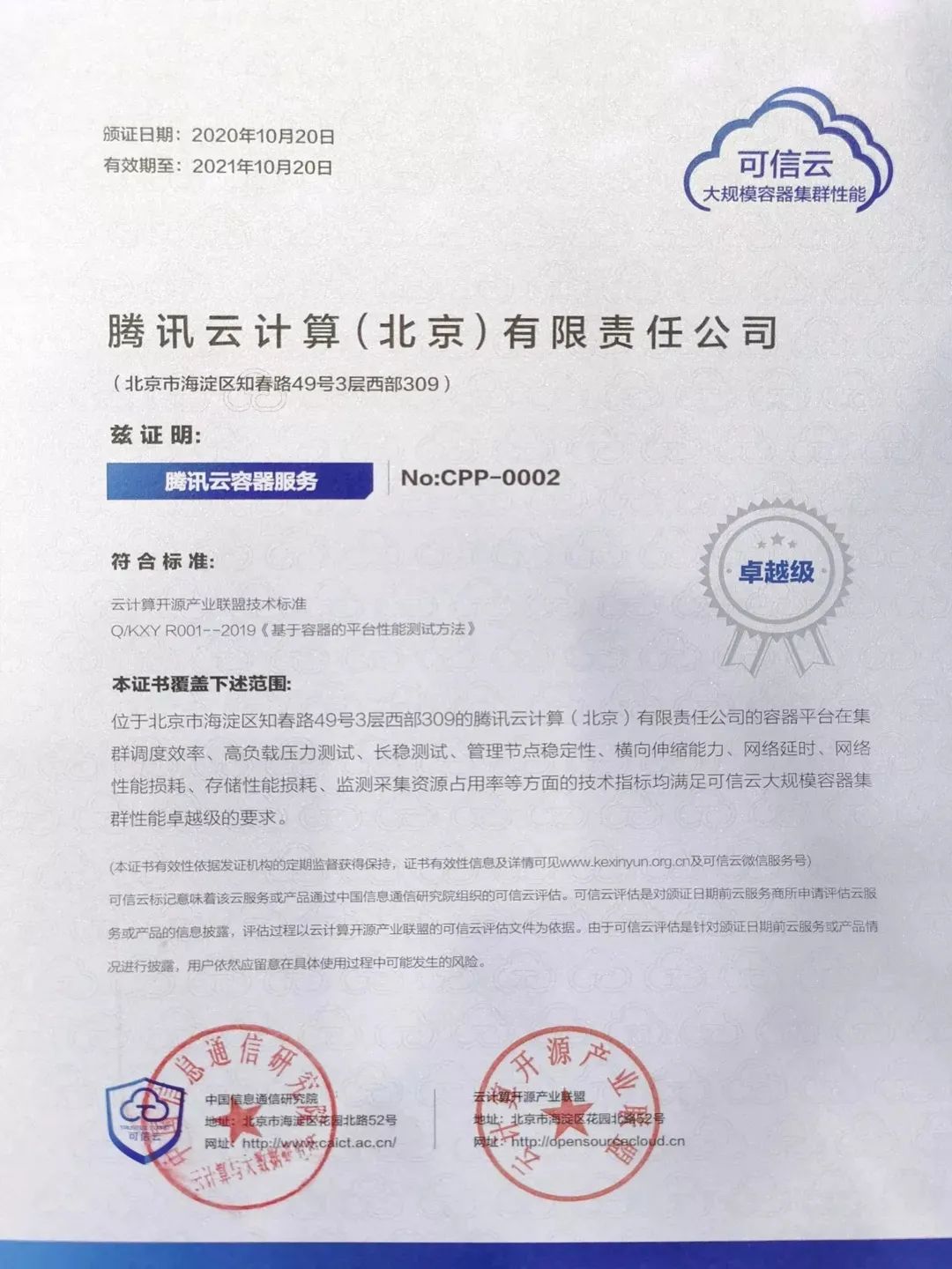 2021年7月,腾讯云容器以最高标准通过了“全栈容器云解决方案”及“金融场景容器性能”评测,成为国内首批通过此测评的企业之一。