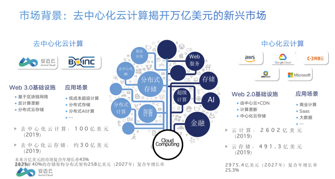 分布式云时代,算力也将从中心部分解放,形成对现有云计算产业市场补充的去中心化云计算,让云计算价值边界得以延伸和拓展。去中心化云计算将解决传统中心化云计算数据存储成本高、数据隐私安全风险高、数字化资产流动性差三大痛点。