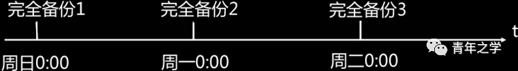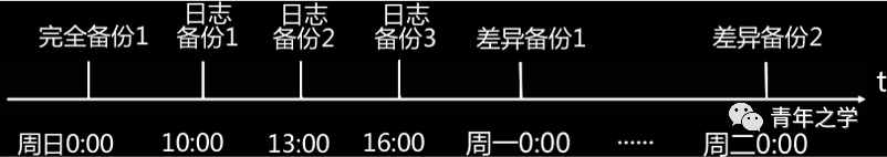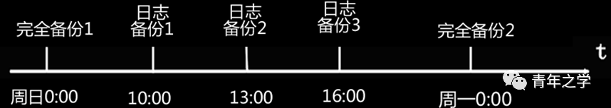 假设在周二晚上11:00系统出现故障,则这时可以将数据库恢复到周一晚0:00时的状态。