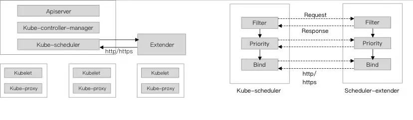 社区最初提供的方案是通过Extender的形式来扩展scheduler。Extender是外部服务,支持Filter、Preempt、Prioritize和Bind的扩展,scheduler运行到相应阶段时,通过调用Extender注册的webhook来运行扩展的逻辑,影响调度流程中各阶段的决策结果。